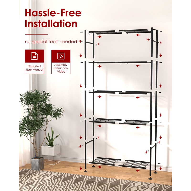 2. The 2-pack rack shelf set is simple to assemble with labeled components and clear instructions—no specialized tools are required. With non-slip adjustable leveling feet and wall fixing kits, these storage racks provide exceptional stability on uneven floors, preventing tipping or wobbling when holding heavy items.