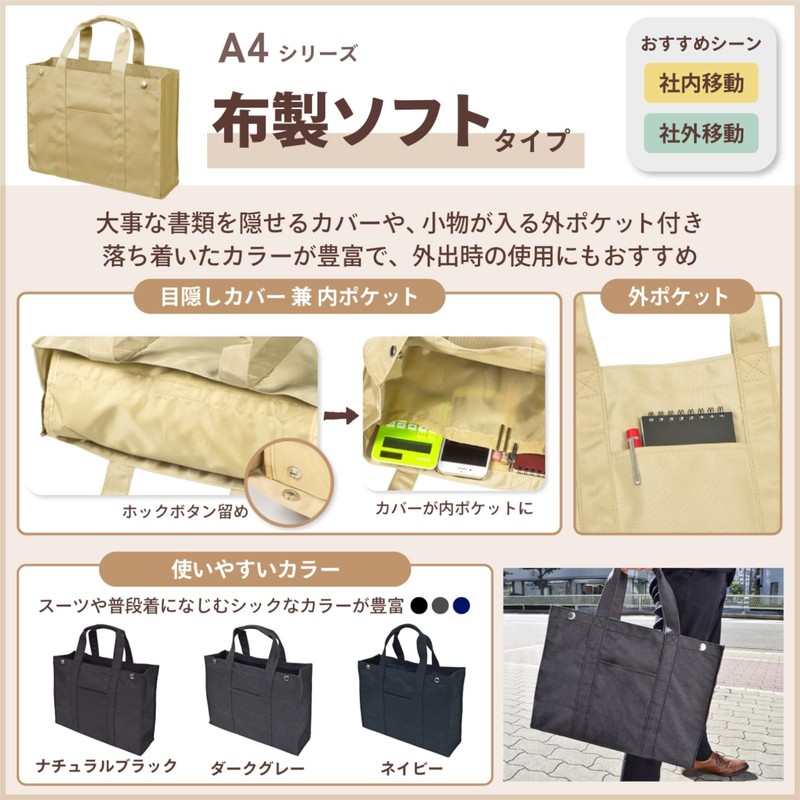 - [Uses] For traveling both inside and outside the company. Tote bag can hold A4 file boxes