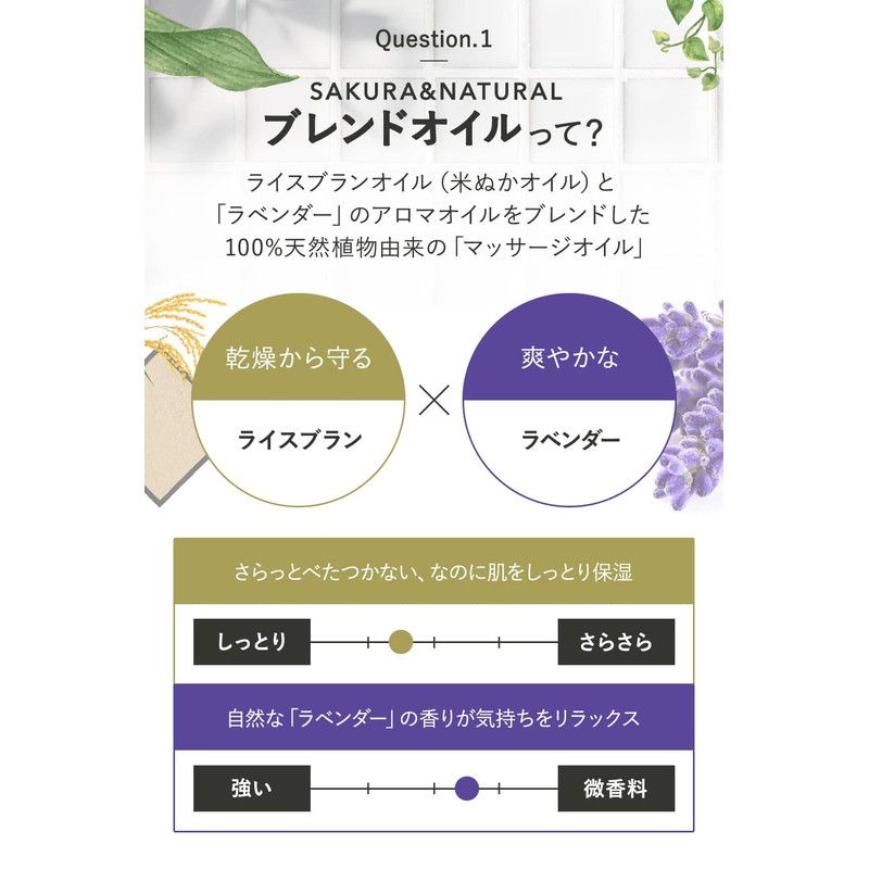 - (SAKURA & NATURAL Blend Oil) A 100% natural vegetable massage oil blended with rice bran oil and Ylang-Ylang aroma oil. Restores body & hair & glossiness, with high moisturizing power