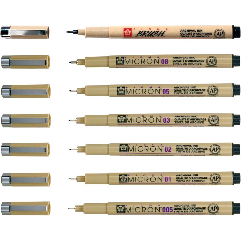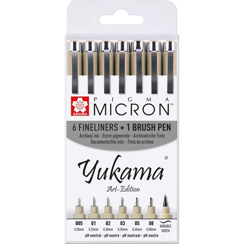 - Yukama Art Edition: Sakura Pigma Micron fineliners & brush pen, 7 black fineliners in a plastic set.