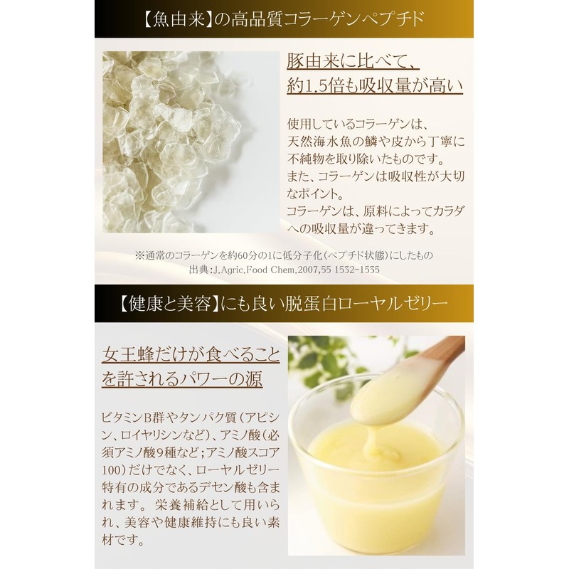 - 【『魚由来』の高品質コラーゲンペプチド】 使用しているコラーゲンは、豚由来に比べて約1.5倍も吸収量が高い、天然海水魚の鱗や皮から丁寧に不純物を取り除いたものです。 また、コラーゲンは吸収性が大切なポイント。 コラーゲンは、原料によってカラダへの吸収量が違ってきます。