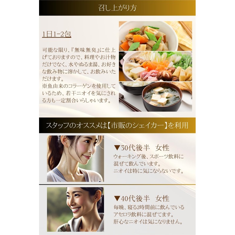 - 【召し上がり方は『1日』1-2包】 可能な限り、『無味無臭』に仕上げておりますので、料理やお汁物だけでなく、水やぬるま湯、お好きな飲み物に溶かして、お飲みいただけます。 ※魚由来のコラーゲンを使用しているため、若干ニオイを気にされる方も一定割合いらしゃいます。
