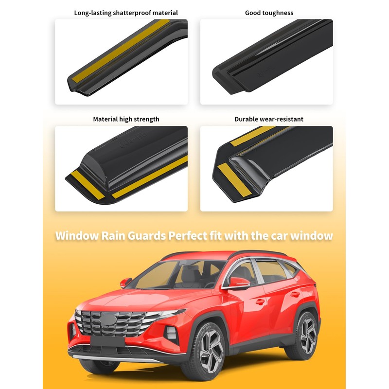 Saleago In-Channel Window Rain Guards are Suitable for Hyundai Tucson 2022-2025Warning:Not suitable for Hyundai Tucson 2016 2017 2018 2019 2020 2021.Please confirm whether your car model is suitable to avoid unnecessary losses caused by wrong purchases.The vent visors made of long-lasting shatterproof material,the quality is quite good.Compared with other window visors on the market,ours are more resilient,not easy to break,and of higher quality.The window deflectors are IN-CHANNEL INSTALLATION, which is more solid than others and is not affected by the Wind,sun,rain,etcOur four-piece sun visor set is made from the original car data and can be perfectly matched with your carThe window deflectors help improve ventilation inside and outside your truck to reduce mirror and window fogging while increasing air circulation.It can also make your car more beautiful and fashionableThis window rain guards is adhesive installation is more convenient and simple,you can complete it independently without the help of othersBefore installation,be sure to clean the windows and passages inside the car, preferably with alcohol swabsIt is best not to touch the Window Visors with water within 72 hours after installation,as this can ensure that the window vent visors rain guards adheres more firmly,not easy to fall off
