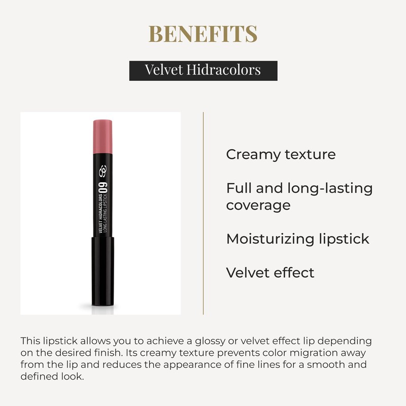 - Velvet effect: allows you to achieve a lip with velvet effect depending on the desired finish. Its creamy texture limits colour migration from the lip and reduces the appearance of small facial lines for a smooth, defined look.