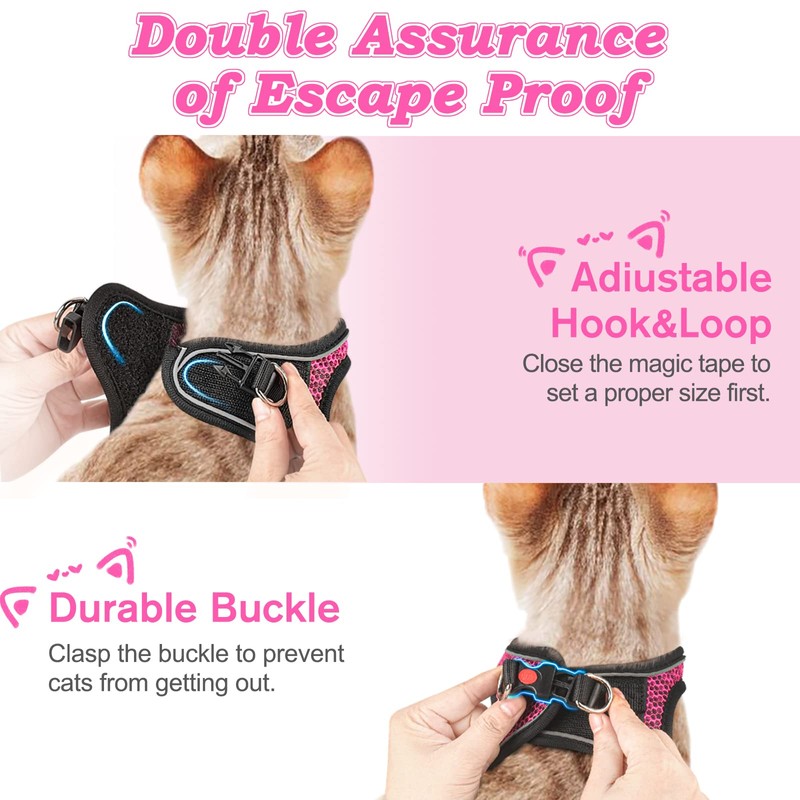 • Easy to Wear: Step in, clip and go. The mesh cat harness is easy to put on and off in seconds with its magic tape on the back. The locking function on the strong buckle that ensures no accidental detachment. The adjustable strap gives the best fit for every cat