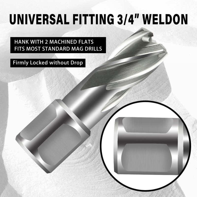- Cnc-machined high precision annular drill bit set with 3/4 inch weldon shank (with 2 flats) for secure clamping and edge finish designed for smooth, reamed, burr-free edges of drilled holes. Use a firm steady pressure throughout the cut for better results