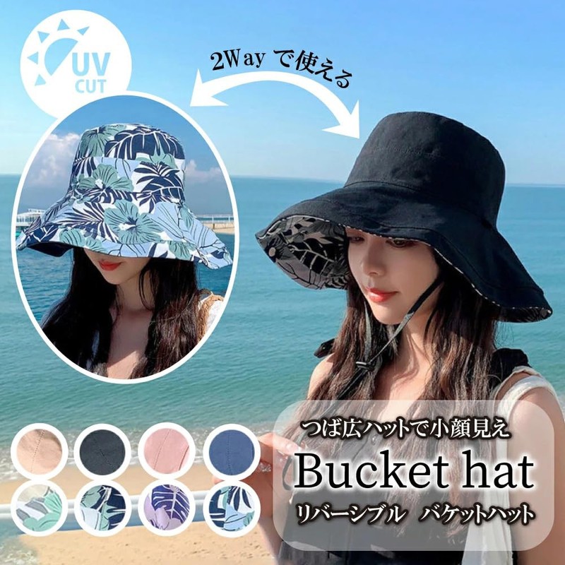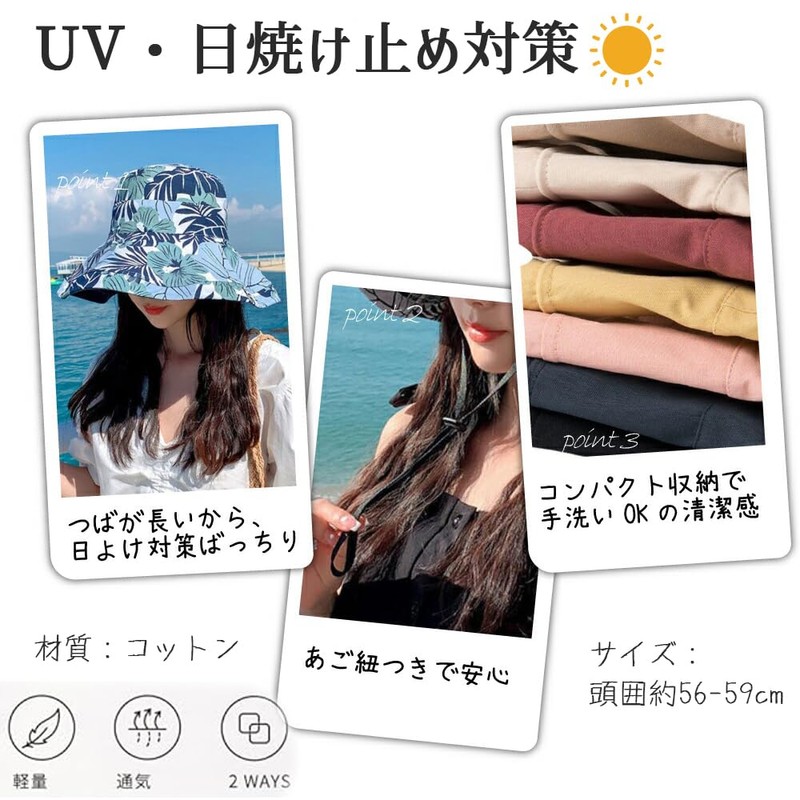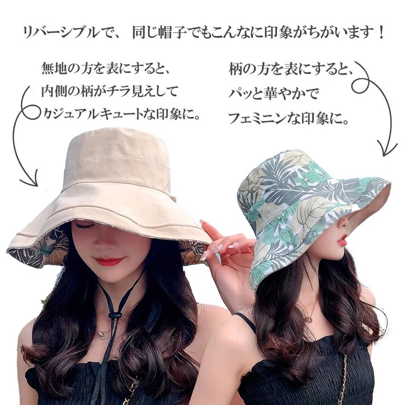 [saliwind] 帽子 レディース 日焼け防止 UVカット リバーシブルハット 日よけ帽子 ハット 夏 紐付き コットン つば広 小顔効果 56-58cm 旅行 通勤 春夏 おしゃれ hat01(葉,ネイビー)