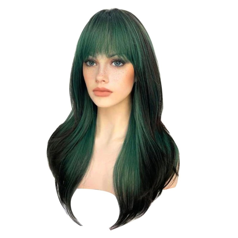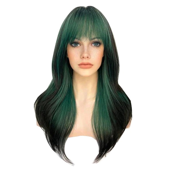 Sallcks Womens Long Layered Green with Black Highlight Wigs with Bangs Heat Resistant Synthetic Fibre Wigs
