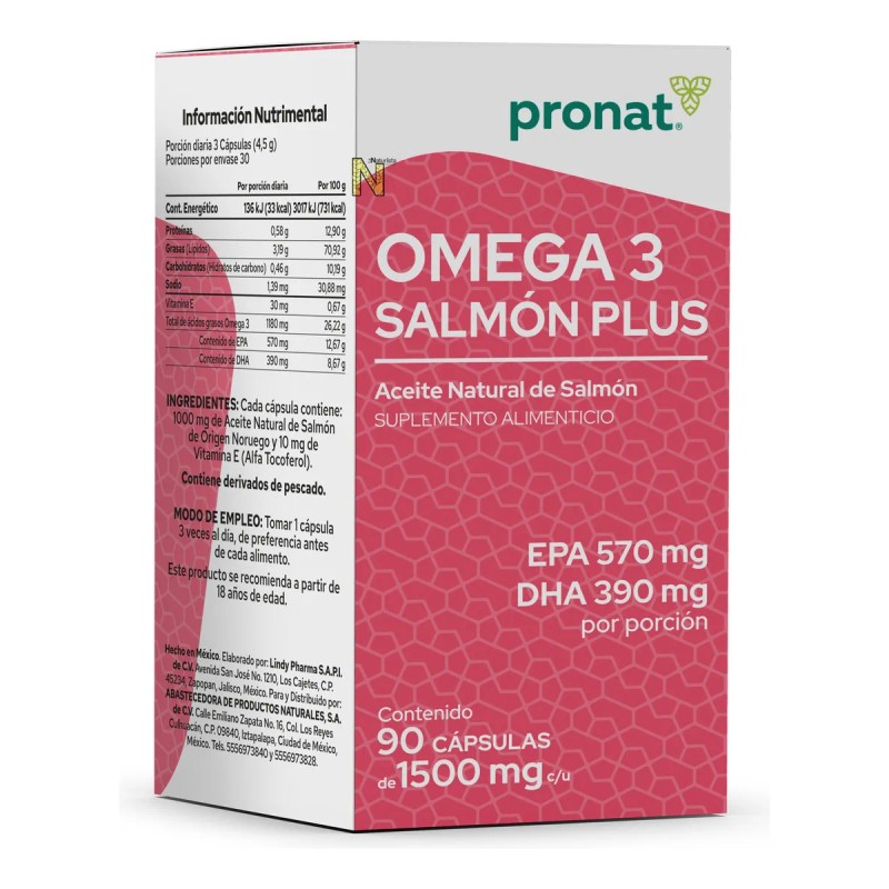 Cada cápsulas contiene 1000 mg de aceite natural de salmón de origen Noruego y 10 ml de vitamina E.