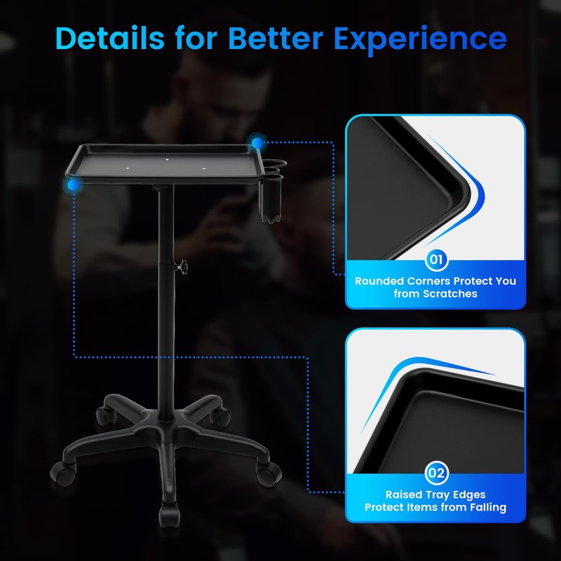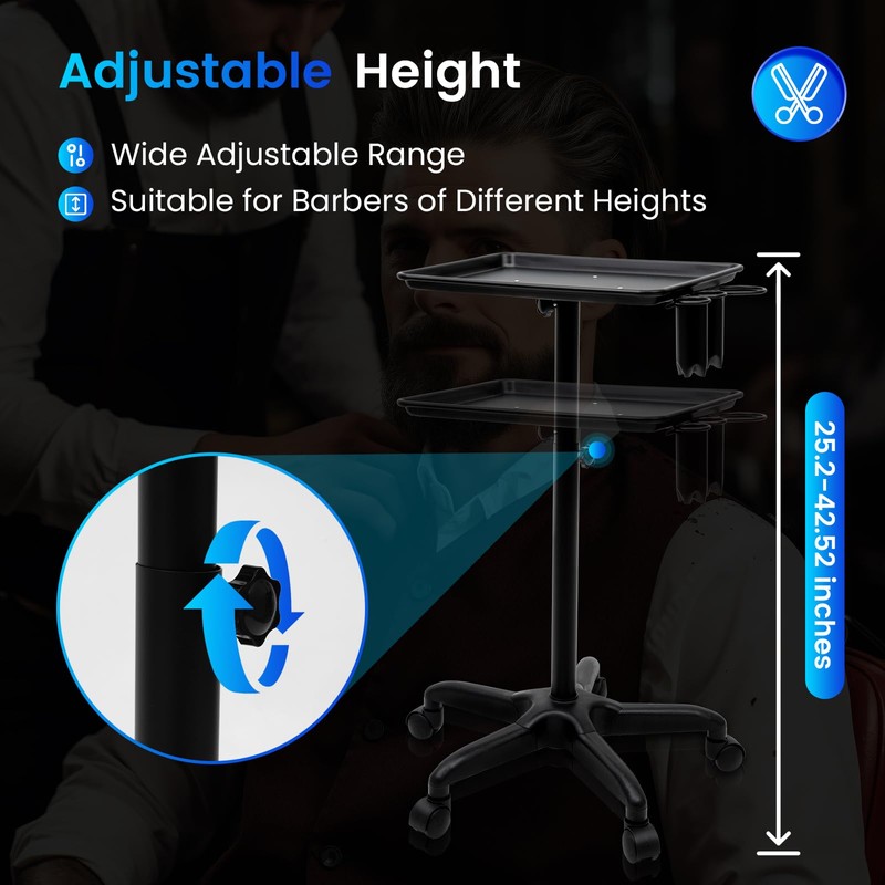 - ADJUSTABLE HEIGHT: The height can be adjusted between 25.2-42.52 inches with a simple turn of the knob on the hair cart, making it suitable for hairdressers of different heights. The edges around the tray are high enough to prevent items from falling, making your use safer.