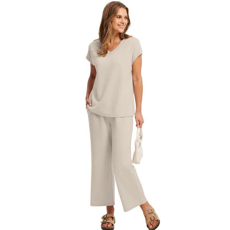 - ✦Design: Two piece sets for women V neck cap sleeve tops,wide leg pants,contoured back for the most flattering rear view,elastic drawstring.