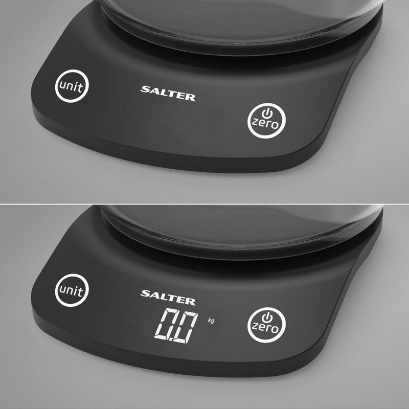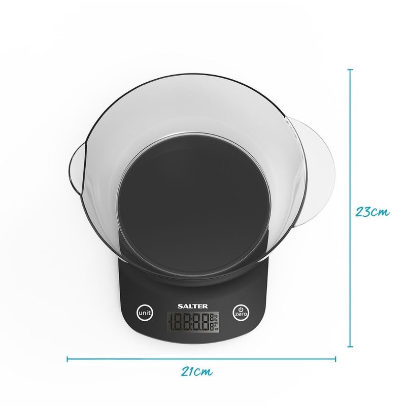 Salter 1074 BKDR Electronic Digital Kitchen Scale, Max 5 Kg, Cooking , Baking, Add & Weigh, Measures Liquids/Fluids, Hidden Until Lit Display, 1.8 litre Dishwasher Safe Bowl, Pouring Lip, Black