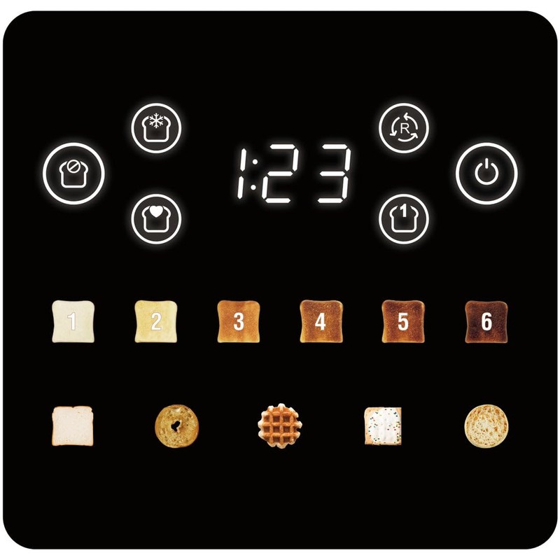 • Bright intuitive touchscreen display with touch controls|6 Preprogrammed functions: Reheat Defrost Single Slice Cancel Memory and Power|Memory setting: Save and select your favorite setting at the touch of a button| Single Slice setting: Evenly toast both sides of bread when toasting a single slice| Personalize your toasting experience with 6 precise shade settings ranging from light to dark|Choose from: Bread Bagel English Muffin Waffle and Pastry|Anti-jam safety shut-off removable crumb tray for easy cleaning|Digital countdown timer lets you know when your toast will be ready|Self-adjusting slots guides and centers bread for an even toast|Convenient cord storage under toaster
