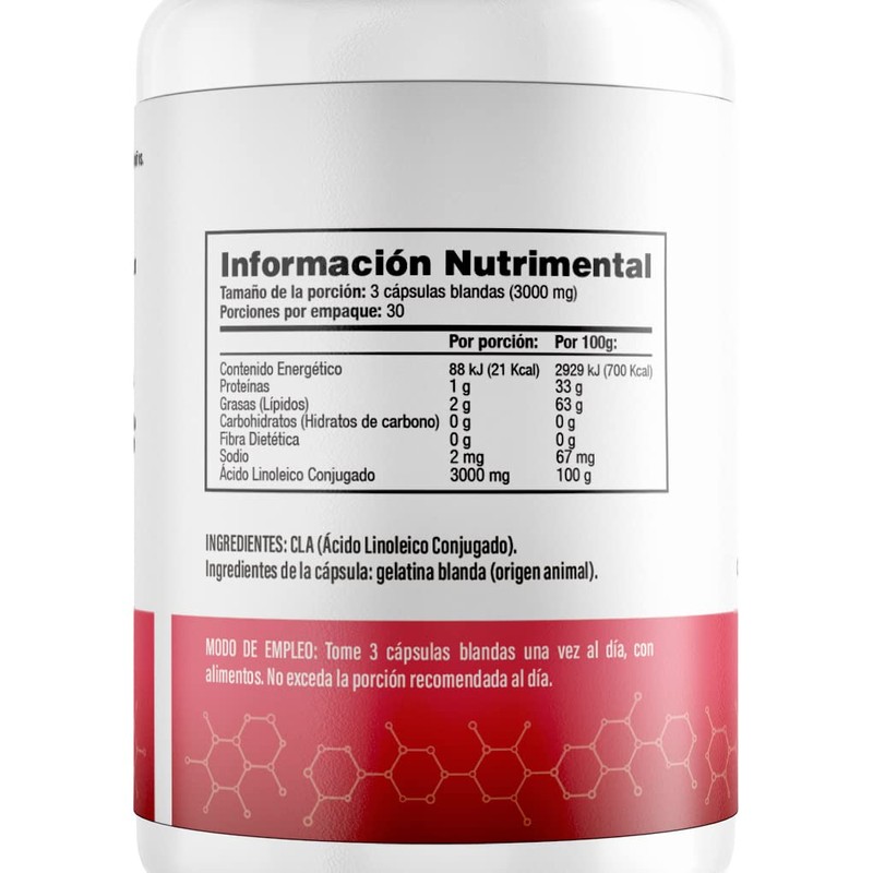 - Cápsulas de Ácido Linoleico Conjugado (CLA) 1000mg, 90 unidades por frasco.