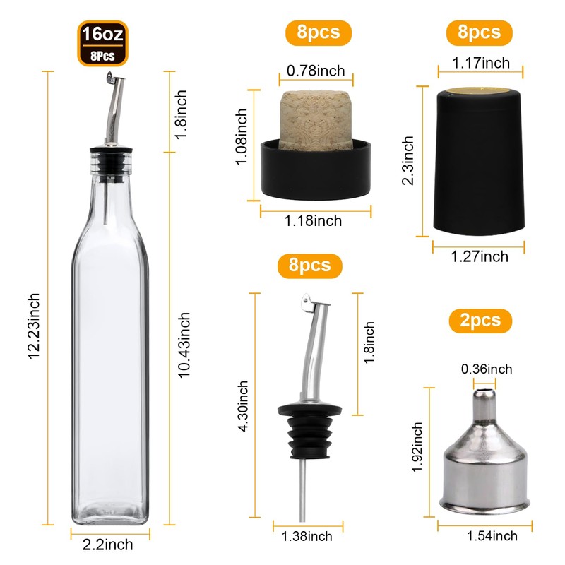 - Eight Pack of 500ml Oil Dispensers: This set includes eight empty oil dispenser bottles, pourers, corks, and caps for easy seasoning and storage.