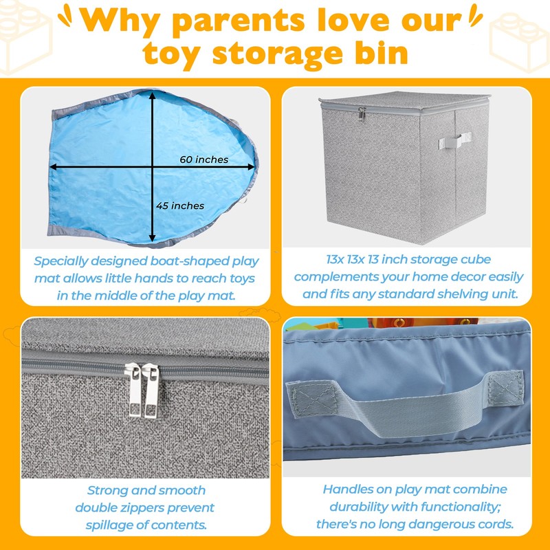 - SAFE, FUNCTIONAL AND IT HAS ZIPPERS - There are no tangly cords or buttons to worry about, making it safe for kids of all ages. Our play mat has durable handles for tipping the toys back into the storage bin. We have also included double zippers on the lid so that nothing can spill out accidently. Warning: Children below 3 years of age must be supervised when using this storage bin and its play mat.
