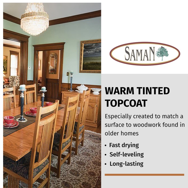- FAST-DRYING WARM TINTED TOPCOAT: The SamaN Hybrid Varnish dries 6 times faster than any other oil-based product. Give a subtle warm tint to the wood coloration to help pop the wood tones which is especially created to match a surface to woodwork found in older homes.