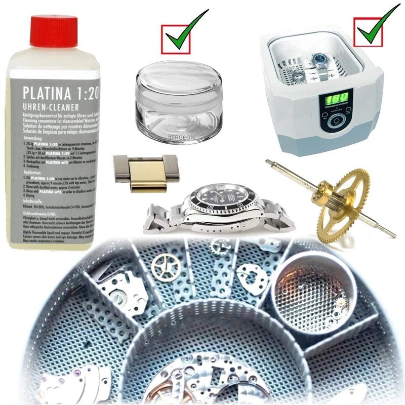 - Watch cleaning concentrate 1:20 for ultrasonic devices or without ultrasonic devices in a ratio of 1:5, cleans watches, parts and metal straps. B High gloss polishing paste for stainless steel, gold and silver metal etc.
