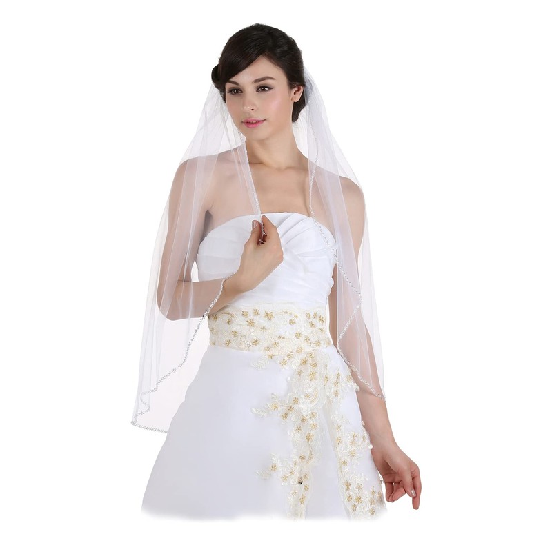 SAMKY 1T 1 Tier Crystals Pearls Beaded Wedding Veil (Fingertip Length 36" White)