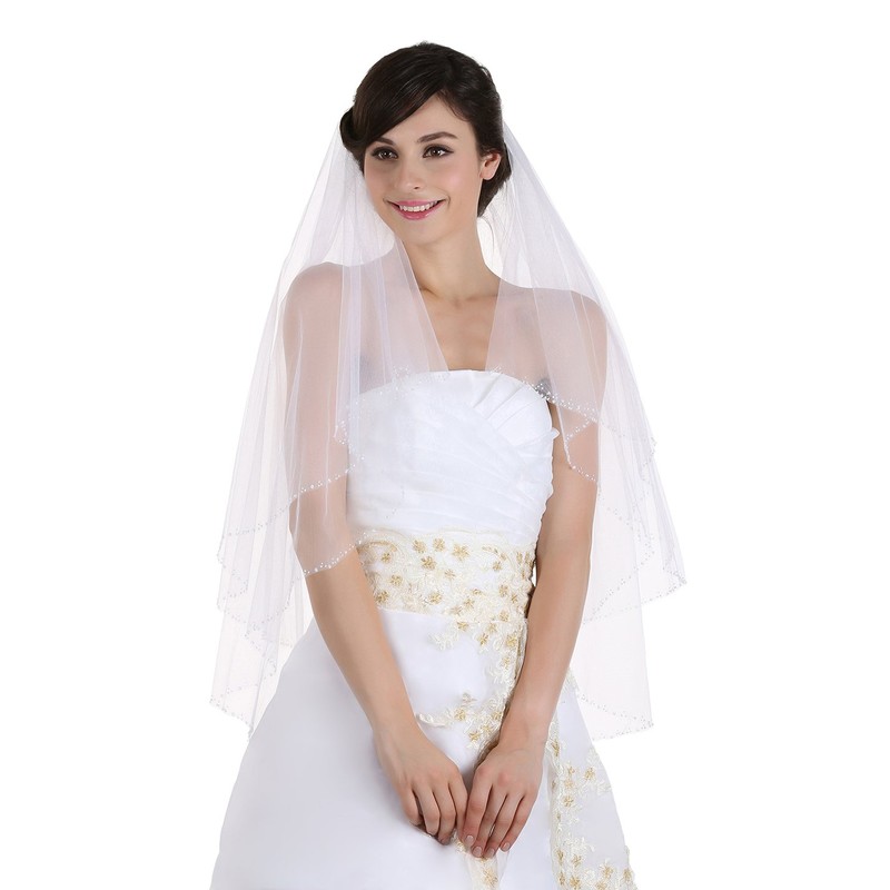 SAMKY 2T 2 Tier Crystal Beaded Edge Bridal Wedding Veil - Light Ivory Fingertip Length 36" V015