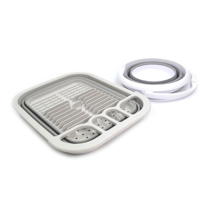 SAMMART 2pcs Kitchen & Outdoor Set : Collapsible Dish Drainer with Drainer Board & Collapsible Plastic Bucket (2, Grey+Grey)