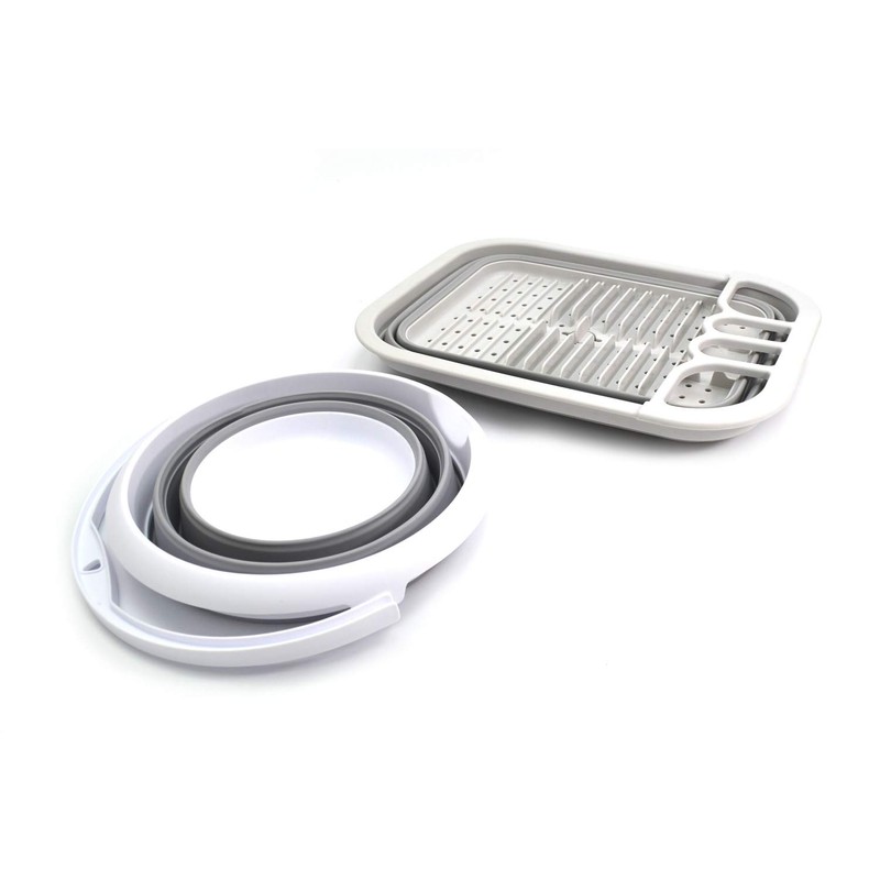 - Collapsible Dish Drainer : Snap in drainer board for convenient use. Separate utensil area keeps smaller items upright for faster drying. Collapsible Bucket: Compact size with comfort grip handle for easy carry and storage.