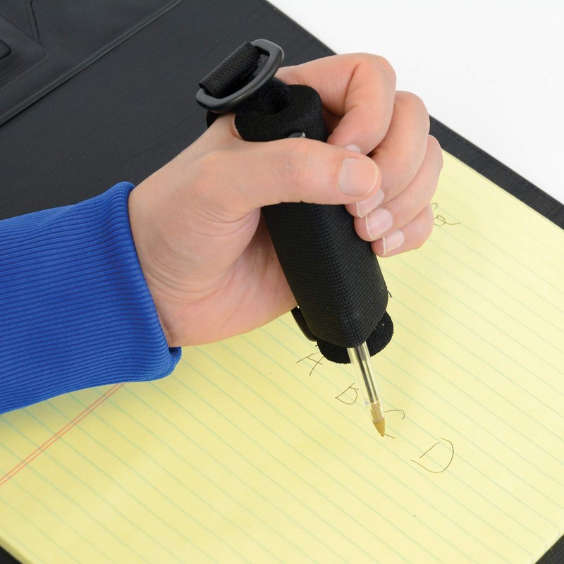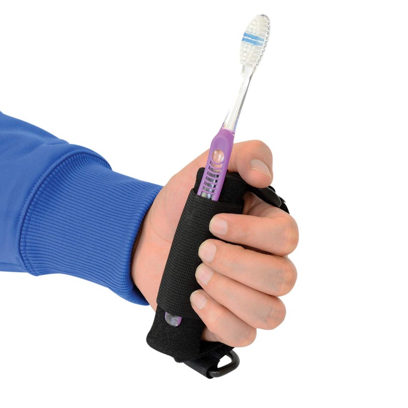 - Cuff with utensil pocket wraps around hand to securely hold utensils, grooming aids and writing instruments with various handle sizes and shapes for versatility