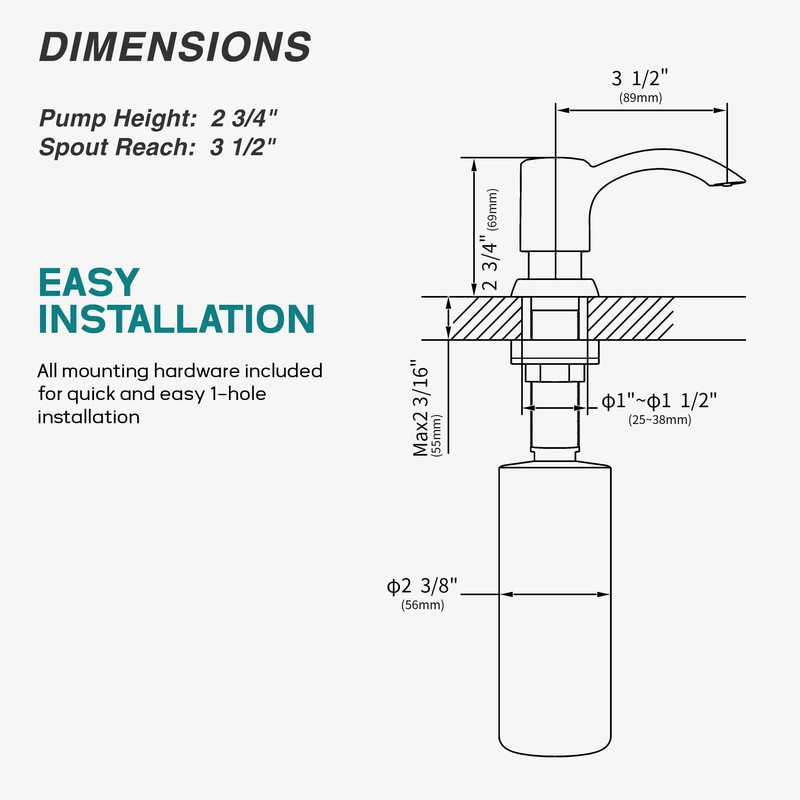 - 🔧 DIY Installation: Our soap dispenser is easy to install and doesn't require a plumber. It can be installed on any sink or countertop, including granite and stainless steel, in just a few minutes.