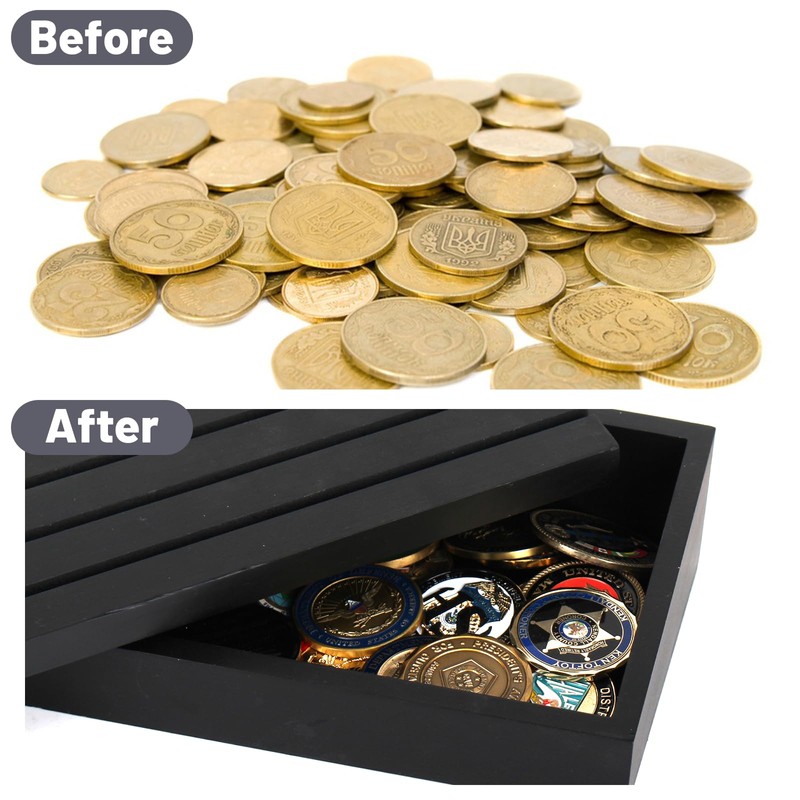 • 【Extra Coin Storage Space】We present to you our challenge coin display case to holder your special collection at your home or office. Challenge coin display case with space beneath for extra storage,allowing you to securely store additional coins without compromising the product's flawless appearance. It is a great gift for the collector, veteran or service member in your life.