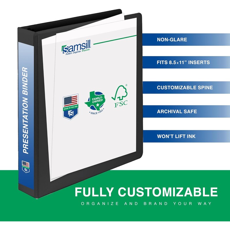 Samsill's three-ring binders make indispensable home, office, and school supplies. While many binders are available, our multipurpose business and school binder offers the economical paper storage and organizational value you've been searching for. This important document binder features a clear overlay along the front, back, and spine, allowing you to customize your presentations, projects, and more. Non-stick materials are used to make this product, which prevents ink transfer or lifting of the copy when materials are inserted into the cover or placed inside. Three binder rings with double boosters hold up to 325 8.5 x 11-inch letter-sized sheets with ease. The rings are mounted on the back lid, allowing pages to lie flat while preventing wear and tear on documents. 2 clear interior pockets provide additional storage with enough space for notes, photos, business cards, or full-size pages. Get crafty with our ring binders and create a baseball card binder, portfolio binder, recipe binder, trading card binder, savings binder, etc. The possibilities are endless!