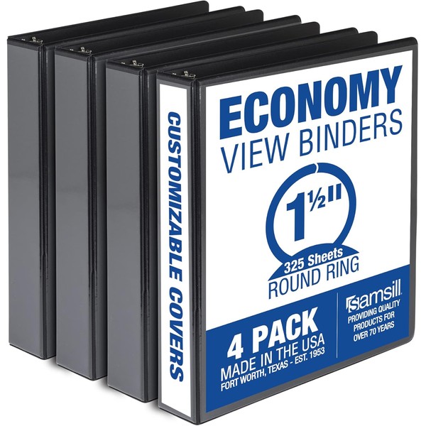 Samsill 1.5-Inch 3-Ring Binders – Set of 4, Black | USA-Made, Clear View Covers, Round Rings, Holds Up to 325 Sheets – Ideal for School, Office, or Home Use