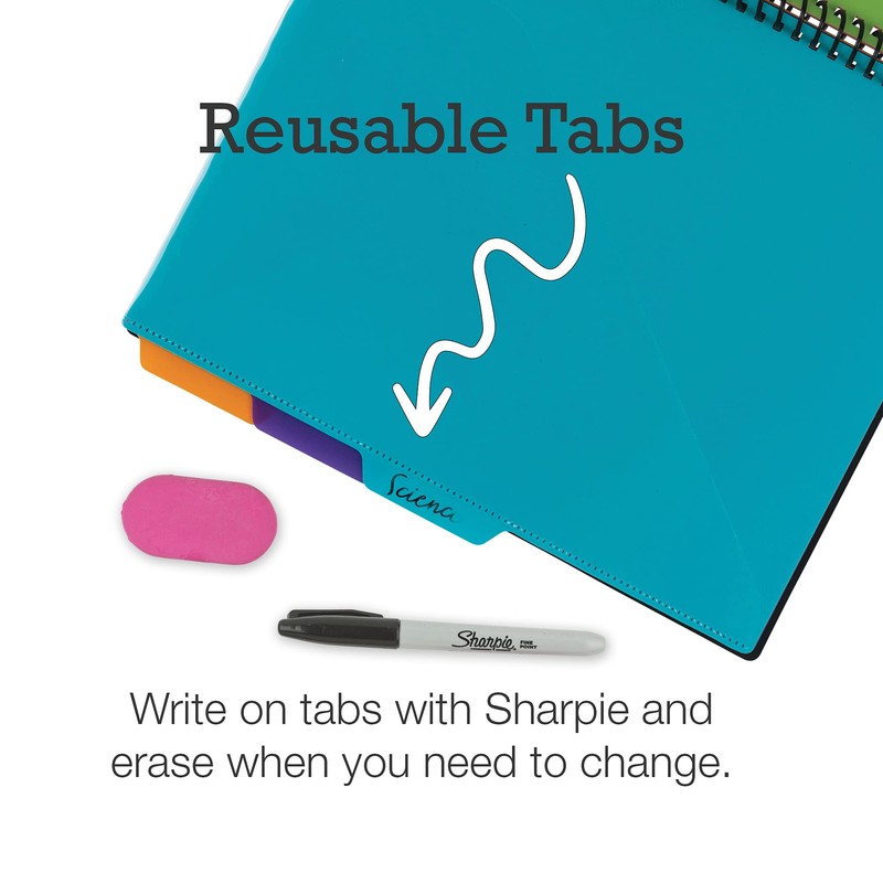 Each tab is erasable and customizable so forget having to use cardboard inserts or sticky white labels. Write on each tab with a Sharpie marker and when you need to change the subject, simply erase and relabel!