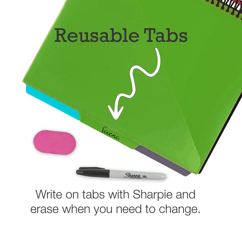 We don’t recommend over stuffing, but you most certainly can do so. Each tab is customizable without having to use cardboard inserts or sticky white tabs. Write on each tab with a Sharpie marker and when you need to change the subject, simply erase clean! With having the flexibility to hold large amounts of paper, we designed a larger spiral spine to accommodate all your documents.