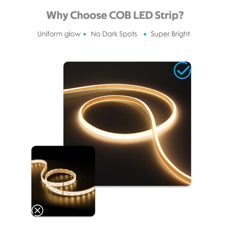 - 【High Brightness COB Strip Lights 】COB LED strip light adopts the latest form of LED technology, multiple led chips are mounted on the PCB board, the light source is more concentrated, so as to achieve higher brightness. Waterproof cob strip light adopts flexible and bending silicone tube as the shell, so that the light is more uniform and soft, no black spot.