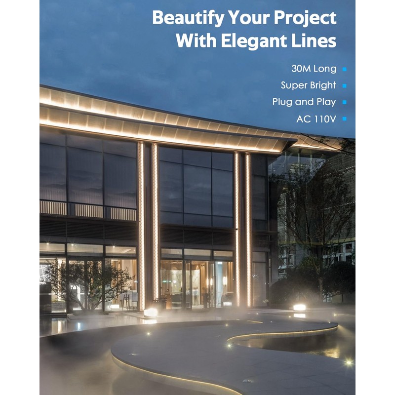 - 【Premium Quality, Bright and Long】 AC 110-130V Input, 100ft/30M continuous length, super brightnes, high-density 288 LEDs/M, total 8460leds/30M, 8W/M, 3000K, CRI>85. It solves the problems of low brightness and short length of 12V/24V low-voltage light strip. Plug and play, no power adapter required. Suitable for lighting projects that need long and premium LED strip.