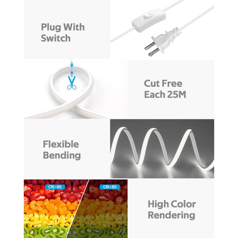 - 【Premium Quality, Bright and Long】 AC 110-130V Input, 100ft/30M continuous length, super brightnes, high-density 288 LEDs/M, total 8460leds/30M, 8W/M, 6000K, CRI>85. It solves the problems of low brightness and short length of 12V/24V low-voltage light strip. Plug and play, no power adapter required. Suitable for lighting projects that need long and premium LED strip.