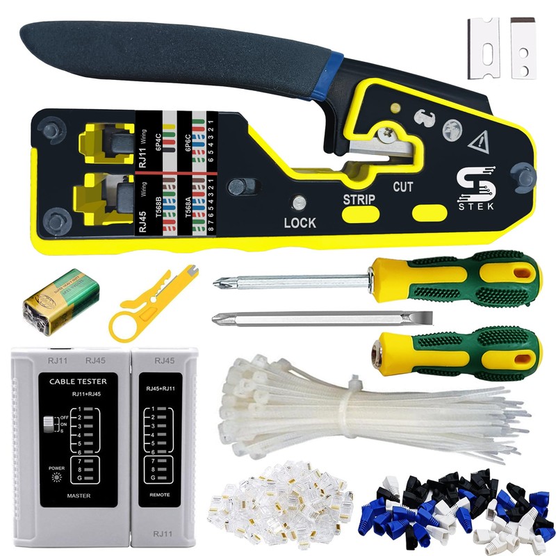 - ๐๐๐๐๐๐๐ ๐๐๐๐๐๐๐๐: 1x RJ45 Crimping tool, 1x wire stripping knife, 1x screwdriver, 1x 6โโ Plier, 100x cable ties, 50x RJ45 Connector boots, 50x connector covers and 1x network cable tester with battery. A complete kit to fulfill you wiring with cutting and crimping perfectly.