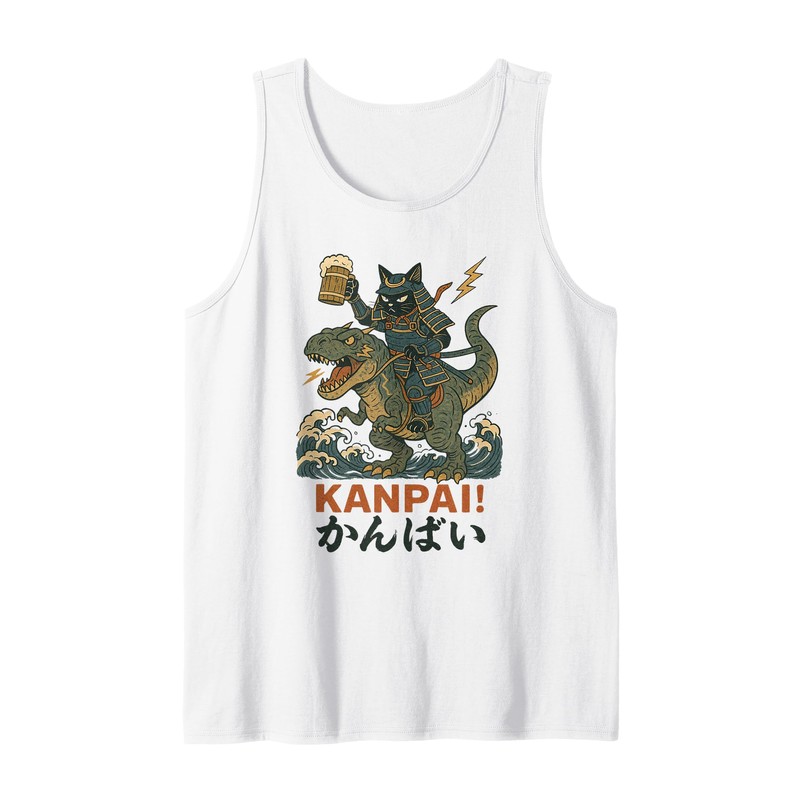- , anime-style graphic of a samurai cat with a beer mug riding a Tyrannosaurus rex. dino with the Japanese Kanji of Kanpai what means Cheers in japanese. pure chaotic energy