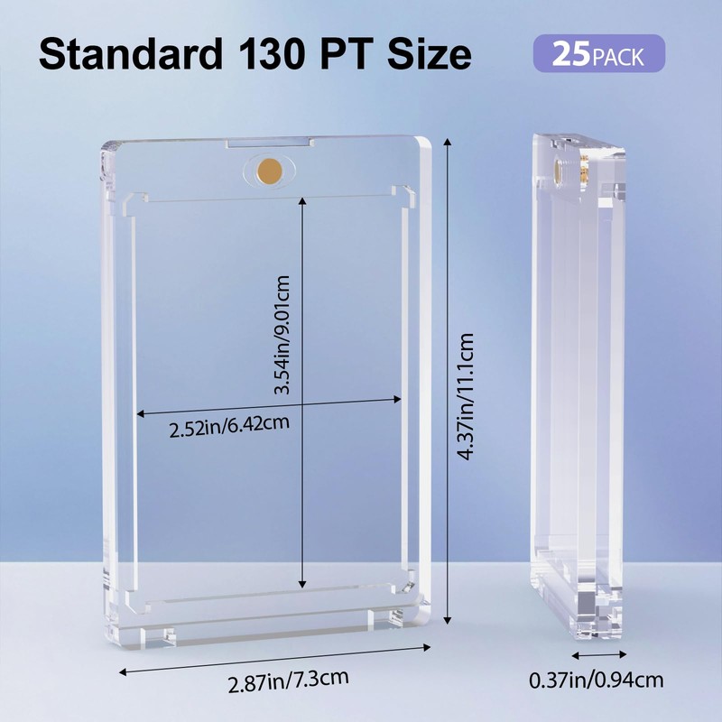- 【SUITABLEFIT】Set includes 25 pcs 130pt card protector (4.37×2.87" exterior; 3.5×2.5" interior slot; 0.37" thickness ). Designed for standard 130PT trading cards like MTG and sports memorabilia