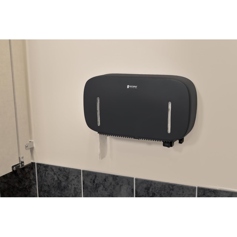 San Jamar Timeless Twin Jumbo Bath Tissue Dispenser, Black, Modern Design, 2-Roll Capacity, Universal Core, 9 Inch Roll Size