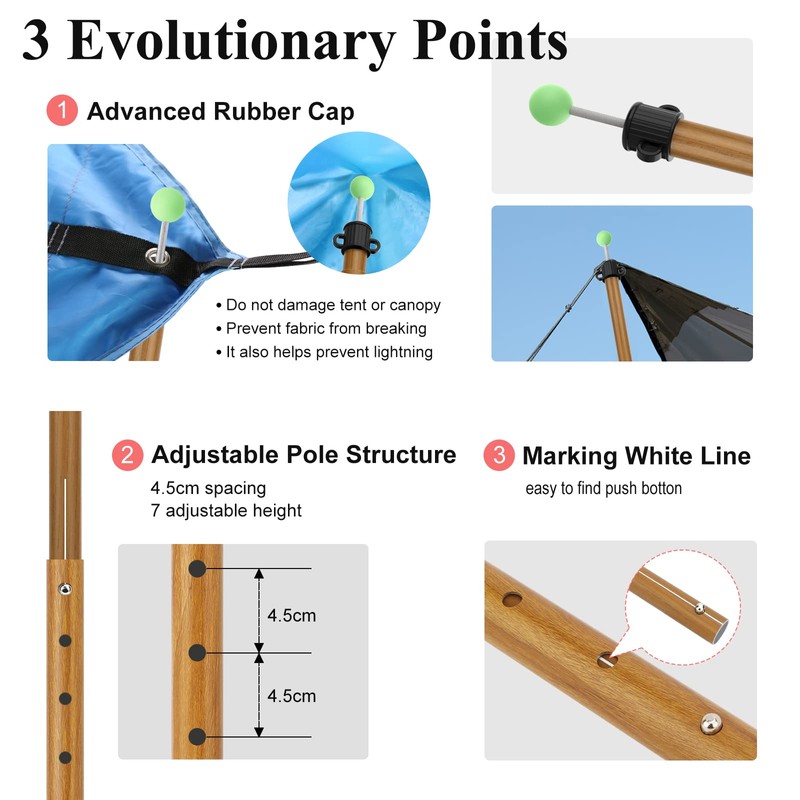 - Aluminum pole with good design: Our tent poles include tarp protection cap, and this cap not only serves as a pole end lock, but also prevents damage to the camping tarp. It also prevents damage caused by lightning strikes during rain and wind. There is anti-slip rubber on the ground part, which has high stability and can withstand strong winds when set up. The tip pole is designed with marked white lines for easy button positioning.