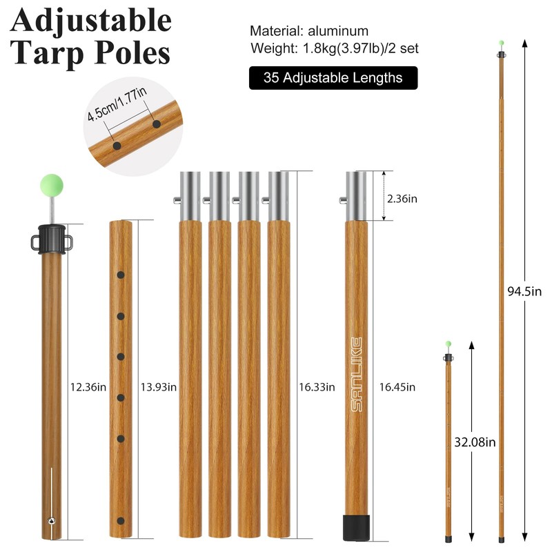 - 35 Adjustable Heights Telescoping Tarp Poles: The top pole can be adjusted in 7 levels at 4.5cm intervals, and the length adjustment from 32in to 94.5in, with a total of 35 different heights. Weight of two set: about 1.8kg/3.97lb. Material: Made of aluminum alloy, high strength, excellent corrosion resistance, not easy to rust. Changed from anodized aluminum coating to powder coating that is more scratch resistant and less noticeable.