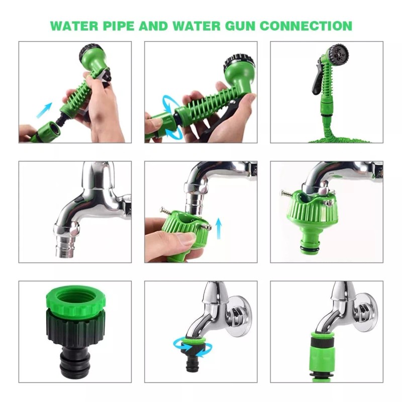 Consejo importante: no deje la manguera llena de agua después de cerrar el grifo, ya que puede dañar el látex y hacer que la manguera se rompa. Por favor, mantenga la manguera sin agua.