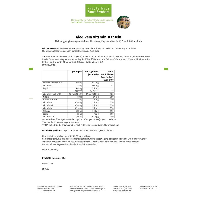 Sanct Bernhard Aloe Vera Vitamin Capsules with Vitamin C, Vitamin E & Vitamin B Complex, 100 Capsules