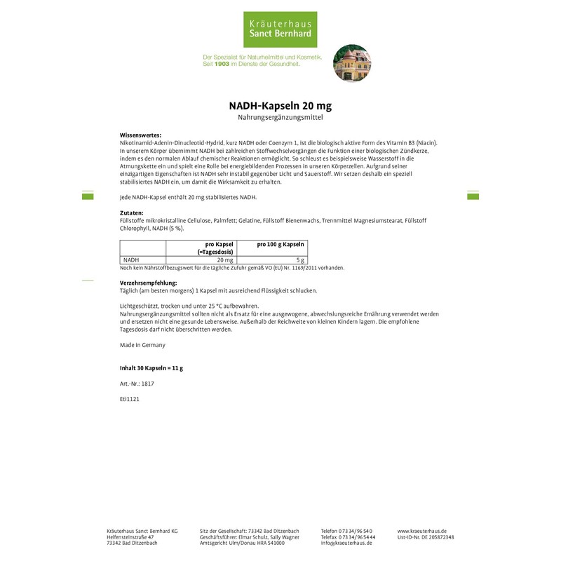 Sanct Bernhard NADH Capsules 20 mg Vitamin B3 (Niacin) 30 Capsules for 1 Month