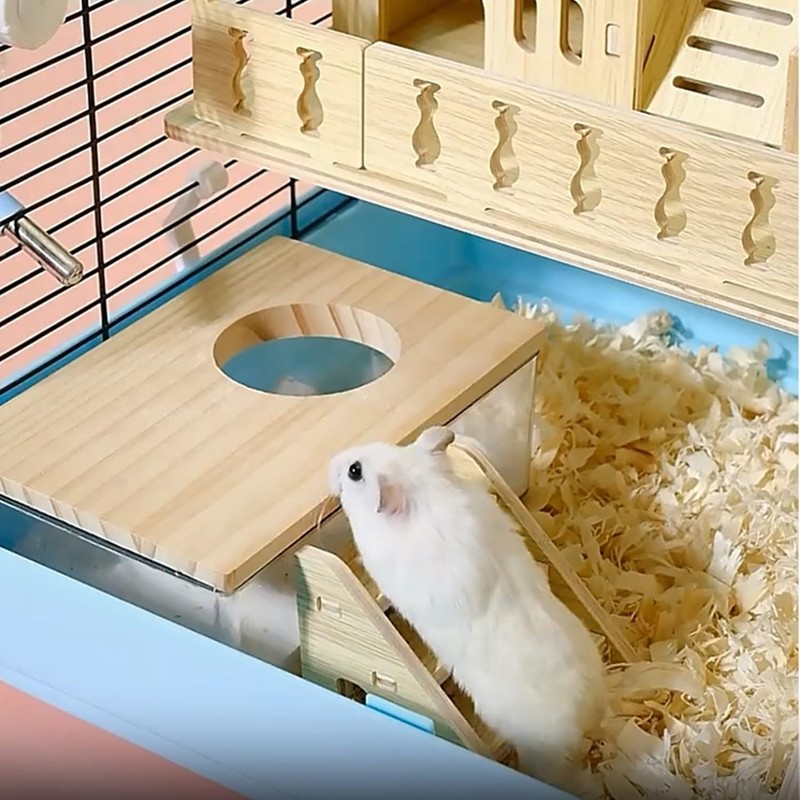 - The transparent acrylic sand bathroom is removable wooden lid of the middle of the cover has a cartoon shaped entrance and exit, which is convenient for pets to enter and exit the bathroom.