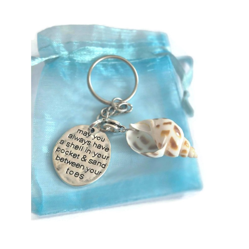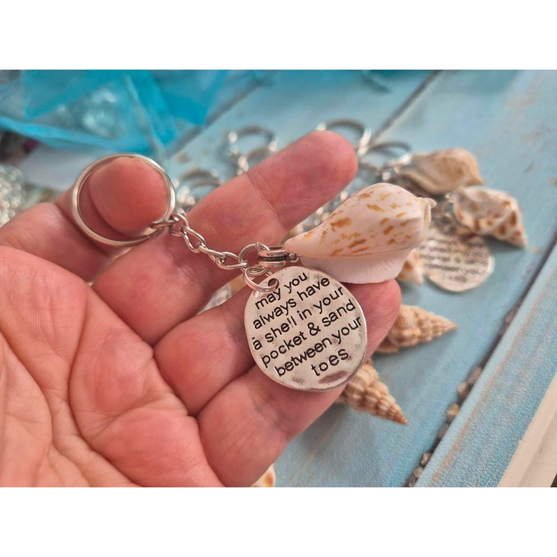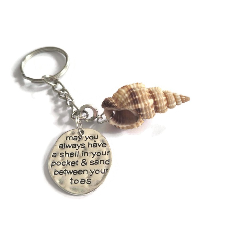 - 25mm keyring loop & a 2" (approx) silver alloy chain with a 25mm (approx) message pendant " may you always have a shell in your pocket & sand between your toes " & a large seashell (selected at random) attached to the keychain