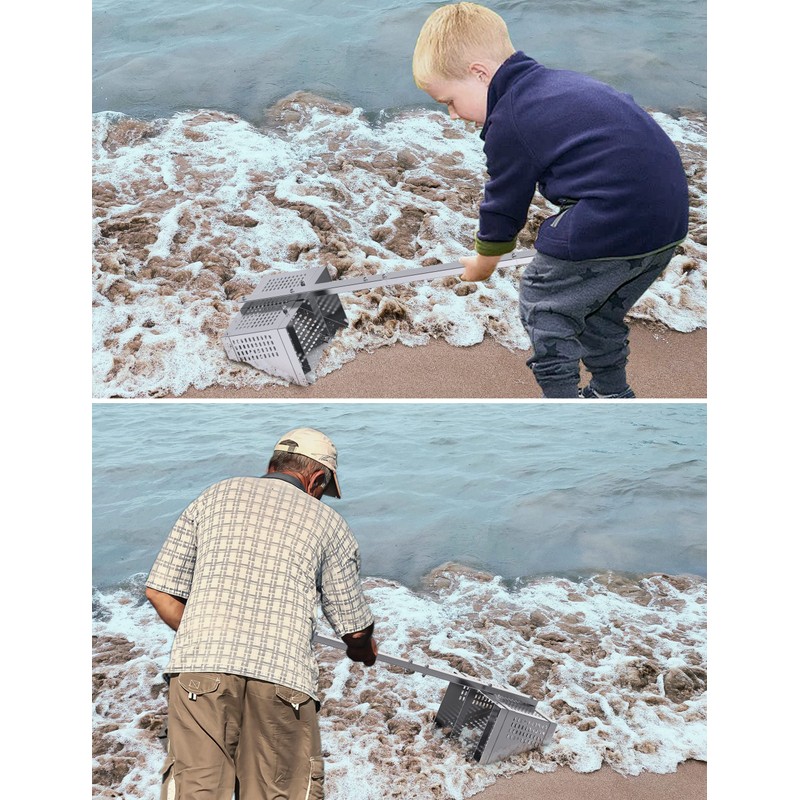 • Innovative Design: The 11.2'' wide trapezoidal basket, featured in the sand scoop saltwater rake, allows you to catch more sand fleas and facilitates sand removal and cleaning. The flat bottom enables convenient vertical storage. Plus, suitable for both adults and kids.