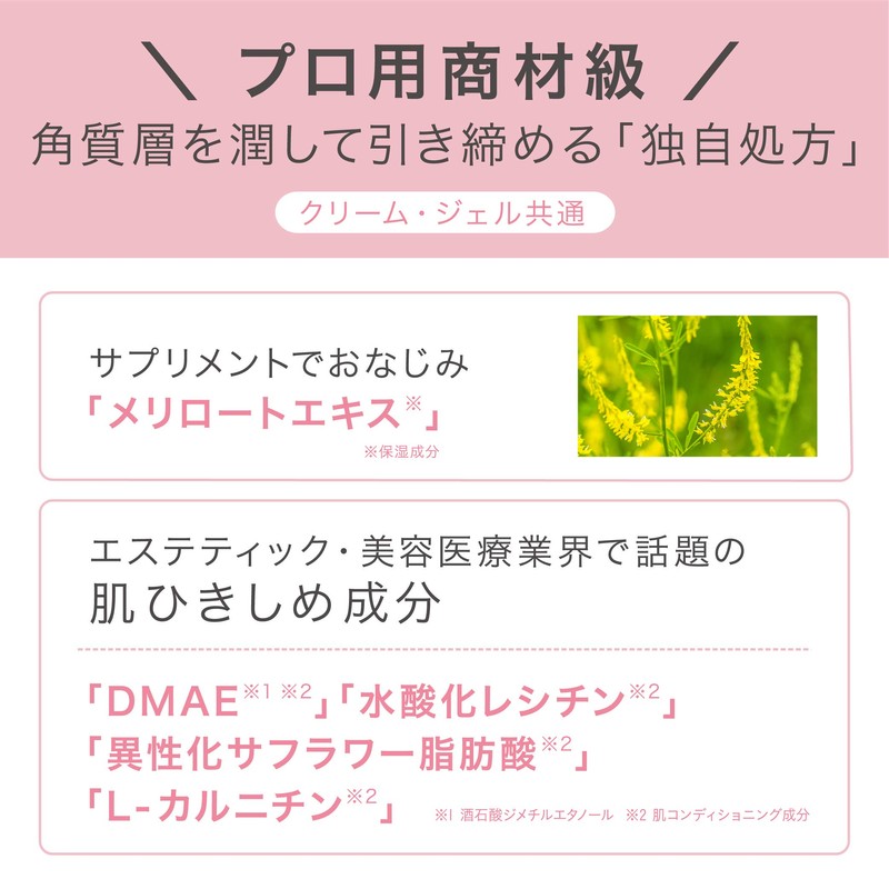 [Squishy Gel Melting] Gel infused with moisturizing ingredients to keep your face fresh. Gel, but it is delicate, and the perfect texture for self-massage - Unique tightening ingredient *1: Because you want to achieve the ideal face line with easy massage. Formulated with ingredients that support the massage effect; *1 dimethyl ethanol liqueur and L-carnitine (above skin conditioning), merelloat extract (moisturizing).