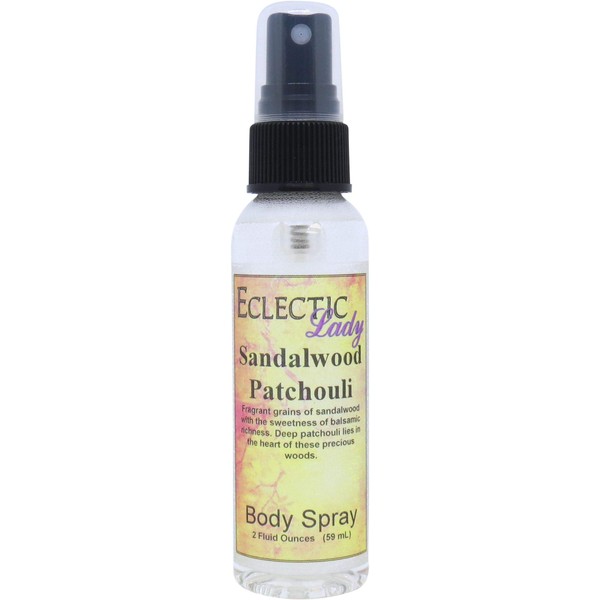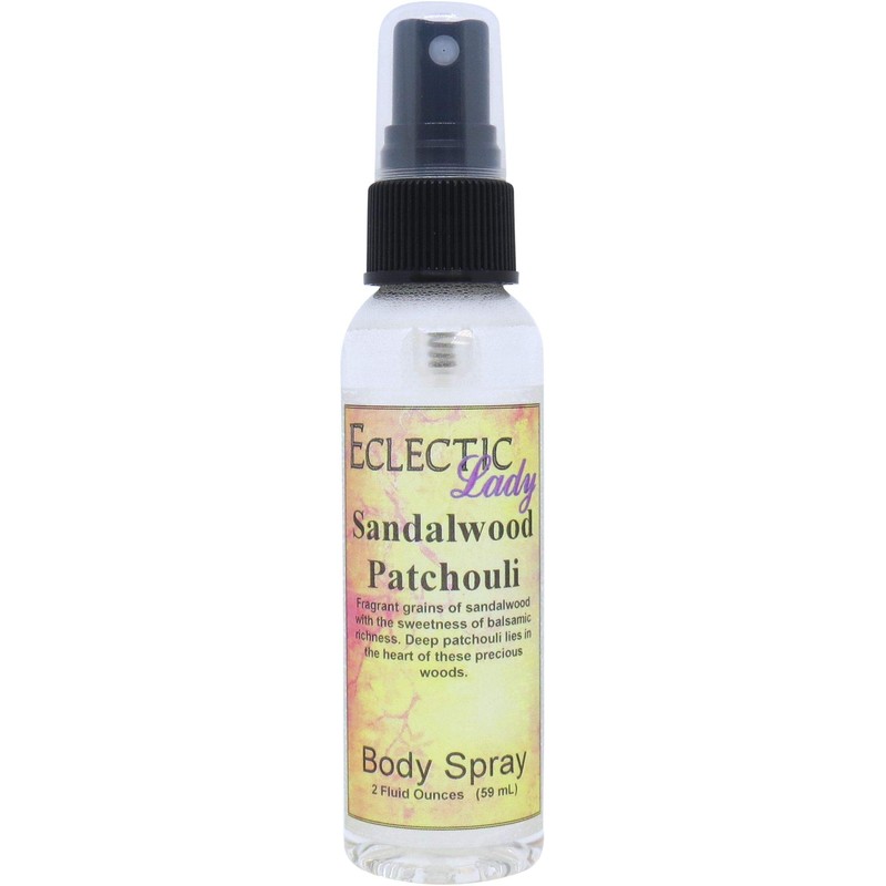 Our Sandalwood Patchouli fragrance is fragrant grains of sandalwood polished with the sweetness of balsamic richness. Enchanting notes of deep patchouli lie in the heart of these precious woods. This fragrance is phthalate free. Our body spray adds a little bit of moisture to your skin along with a light fragrance. Our Double Strength formula contains double the fragrance of our original body sprays for people who like a stronger body spray. All of our products are made to order. To avoid leakage in transit, Eclectic Lady tapes all caps on our sprays and places each bottle into it's very own reclosable bag.